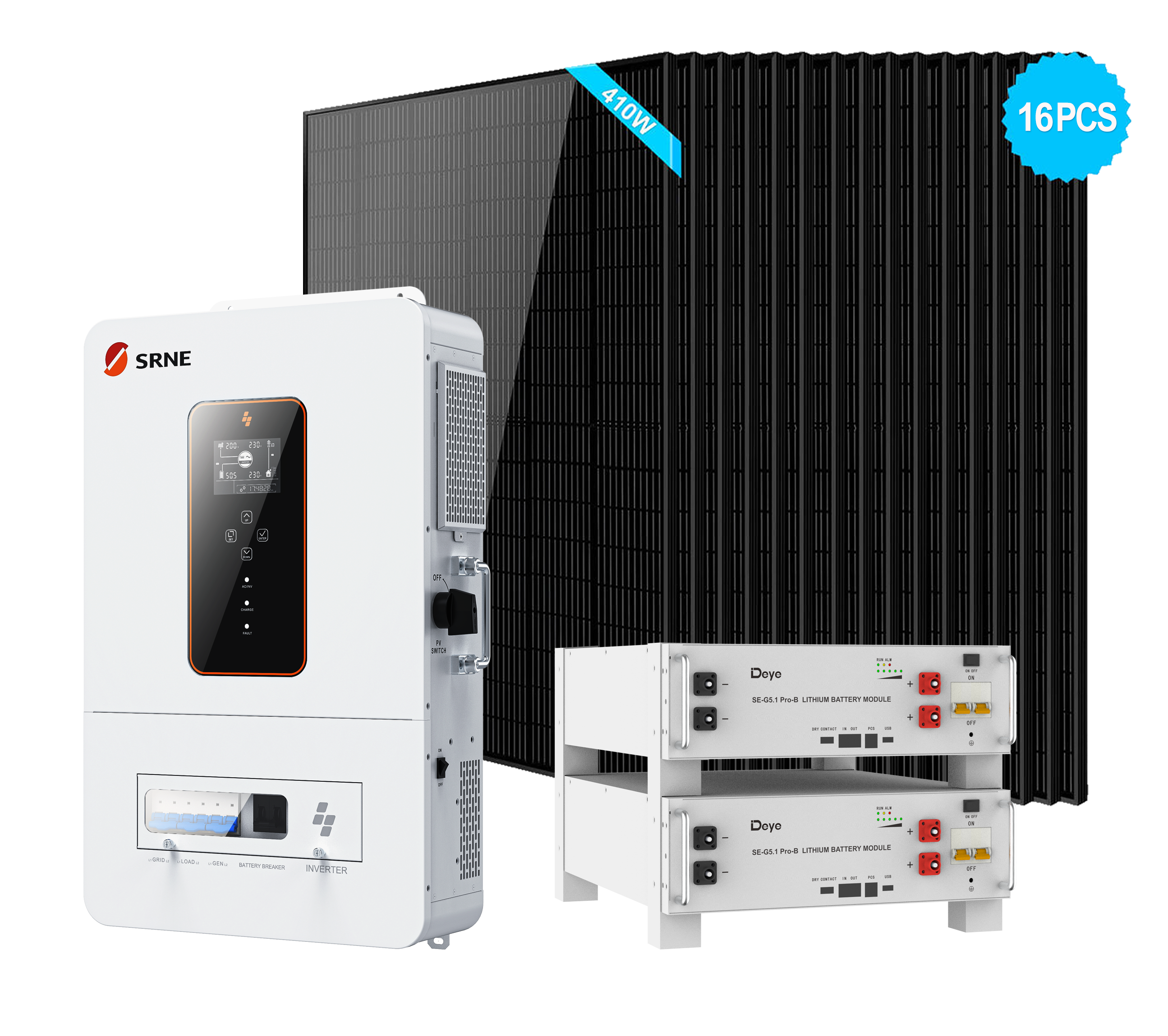 Off-Grid Solar Kits With SRNE 6.5kW Off-Grid Inverter + 2PCS Deye SE-G5.1 Pro-B 5.12kWh LFP Rack-Mounted Battery + 16PCS 410W Solar Panels